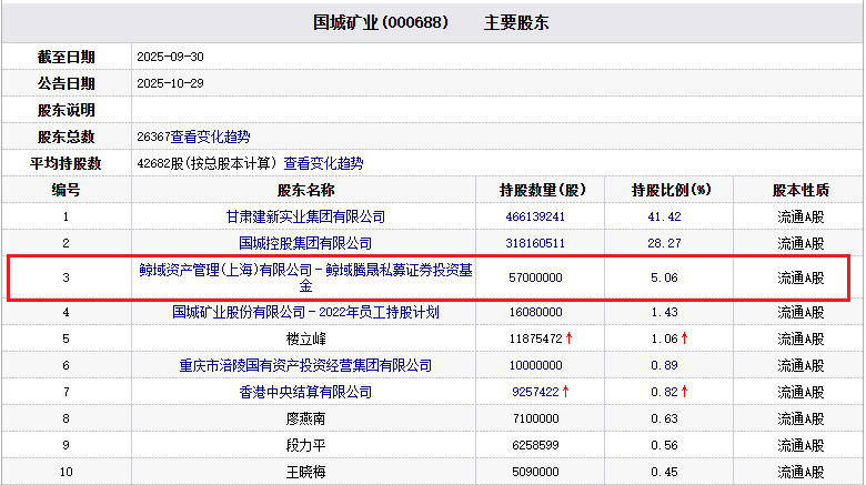 中国经济网北京11月24日讯:国城矿业(000688.SZ)今日跌停,截至发稿,跌24.02元,跌幅10.00%。国城矿业21日跌停,跌幅9.98%,收于26.69元。截至2025年9月30日,国城矿业主要股东中,鲸界资产管理(上海)有限公司——鲸界天盛私募证券投资基金持股5.06%,为第三大股东。 2024年,国城矿业实现营业利润19.18亿元,比上年增长60.37%。归属于上市公司股东的净利润为-1.13亿元,高于上年同期的6300万元。归属于上市公司股东的扣除非净利润发生损益为-9000万元,低于上年同期的6500万元。经营活动产生的现金流量净额为2.26亿元,同比下降61.08%。据国城矿业2025年三季报显示,公司前三季度实现营业利润17.18亿元,较去年同期增长24.60%。归属于上市公司股东的净利润4.5亿元,较上年同期增长765.89%。扣除非经常性损益后,归属于证券交易所上市公司股东的净利润为-2.03亿元。经营活动产生的现金流量净额为-3.16亿元。第三季度,国城矿业实现营业利润6.33亿元,同比增长5.07%。归属于上市公司股东的净利润-7000万元。氮归属于上市公司股东的扣除非经常性损益的净利润-6800万元。天眼查APP显示,国城矿业有限公司(原建新矿业有限公司)成立于1978年,位于四川省阿坝羌藏族自治州。主要进行实验研发的公司。公司注册资本为1,117,635,447元,实收资本为466,139,200元。它于1997年完成首次公开募股。